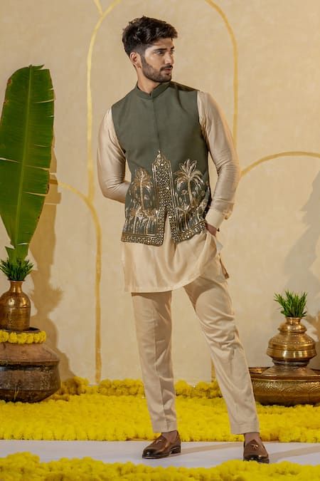 Mehndi ceremony needs a dedicated outfit, opt for this sophisticated and earthy look. The linen green bundi gives a relaxed and breathable structure. A subtle jacket with masterful craftsmanship, fine threadwork and pearls near the collar, paired with an ivory simple kurta and churidar give this outfit an exquisite look. Linen ensures the outfit stays sharp and stylish.