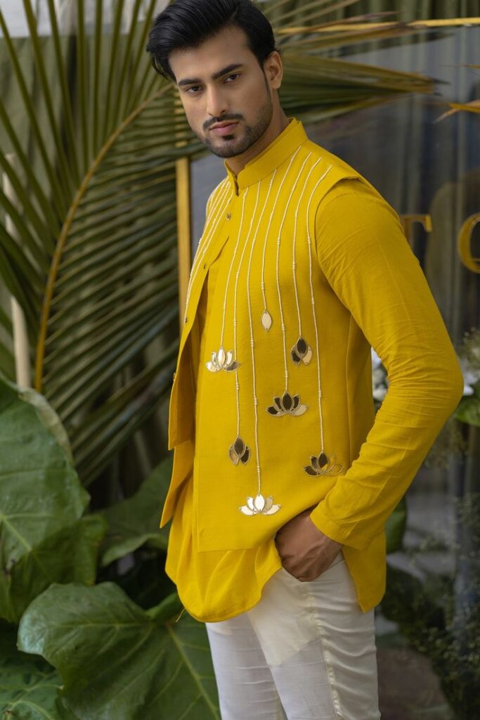 Yellow is just such a vibrant and celebratory color. It goes well with any ceremony, not just haldi. Yellow Chanderi silk short kurta paired with a matching bundi jacket with subtle and rich lotus motifs, pearls and beads. This light weight kurta is light weight and easy to carry in the daytime.
