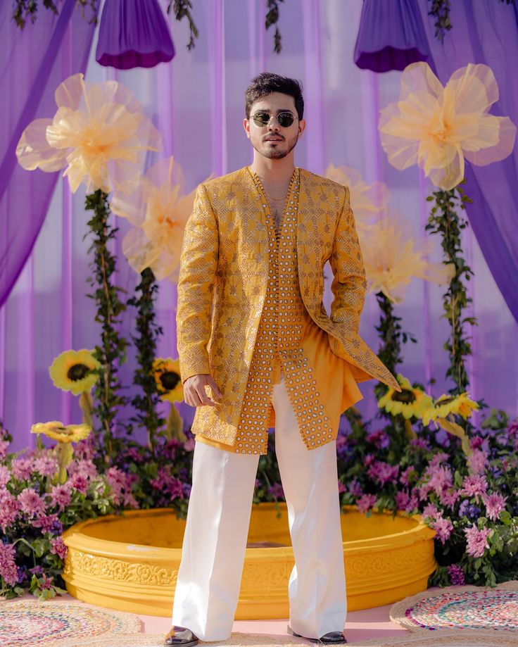The open jacket creates a cinematic flair and powerful look. This is a perfect indo-western outfit for men.